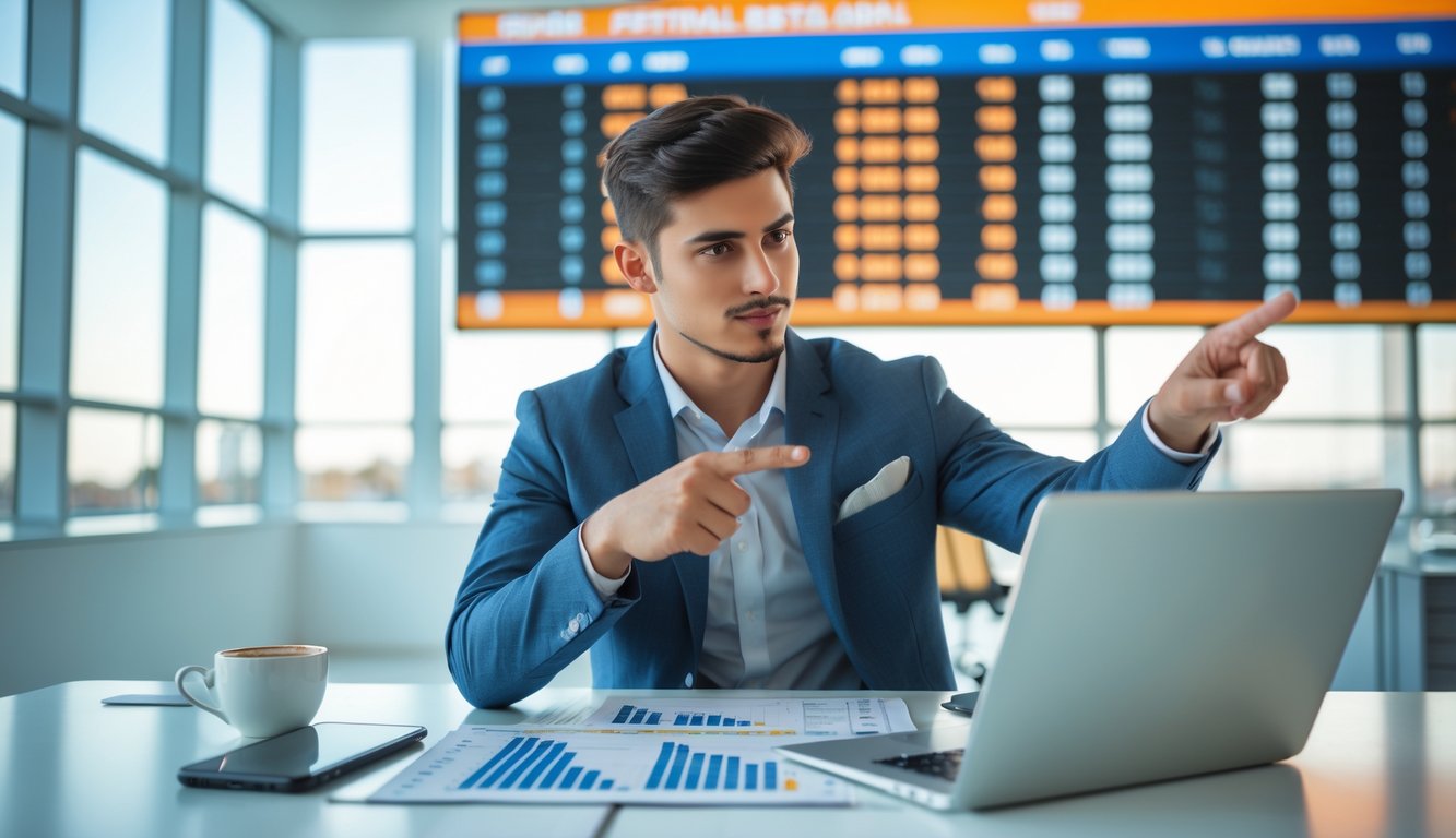 Seorang pria muda duduk di meja dengan laptop, menganalisis peluang taruhan sepak bola dengan grafik dan data di sekitarnya.